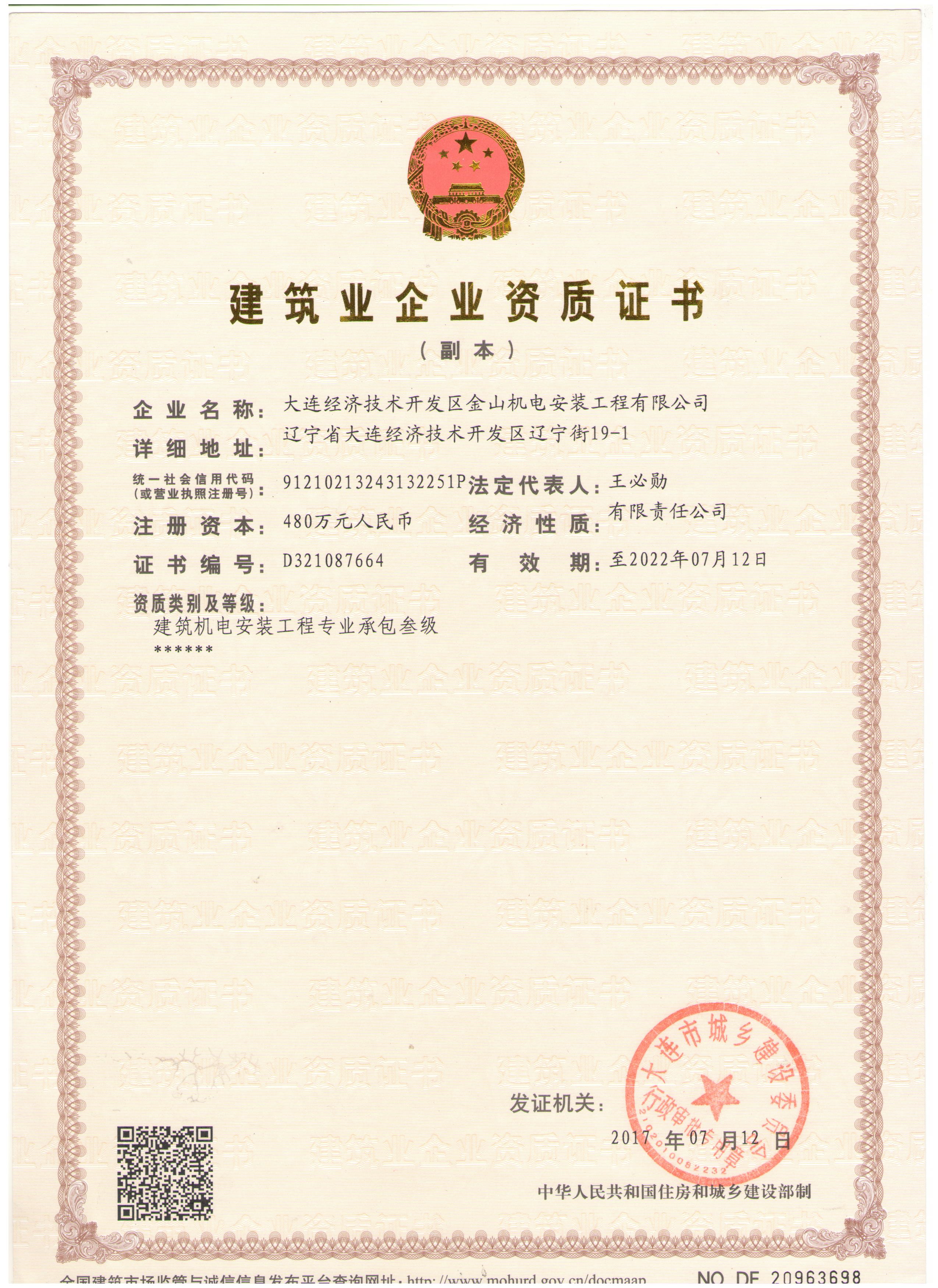 版權所有◎2023 大連經濟技術開發(fā)區(qū)金山機電安裝工程有限公司 ? 網站建設:中企動力 大連 營業(yè)執(zhí)照 SEO
